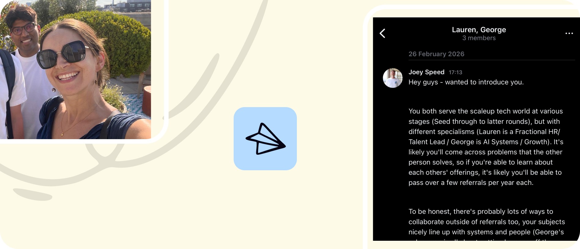 Small curated groups of 3 to 4 non-competing founders. Four facilitated sessions per year